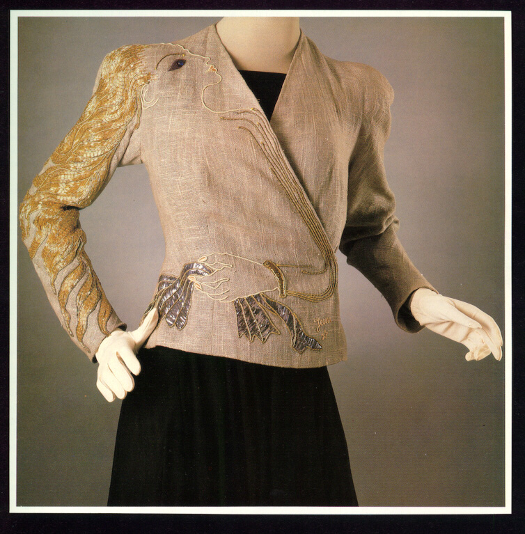 Famosa jacket Schiaparelli firmada (bajo dcha.) por Jean Cocteau. Dibujos y el típico perfil de Cocteau bordados sobre tela de lino.