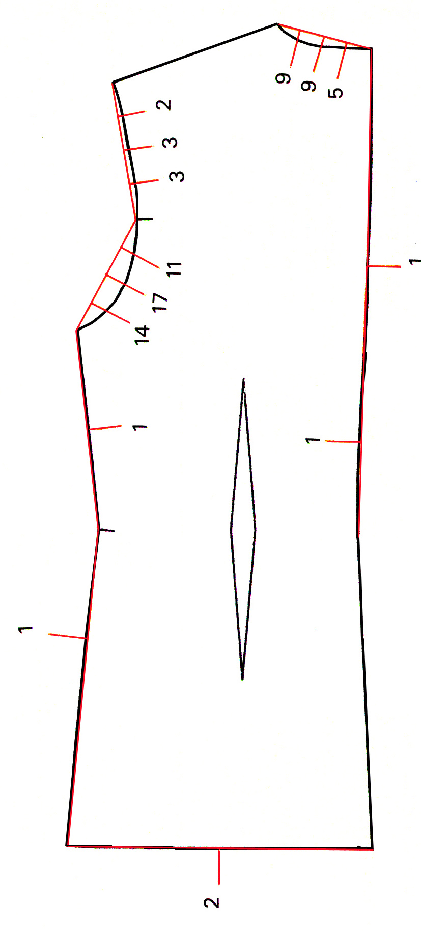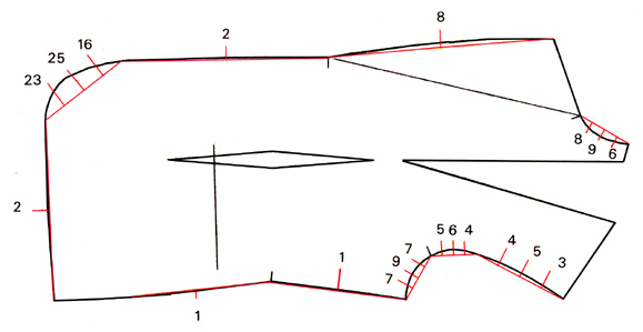 Caída en redondo. Pinzas de entalle en trasero con forma en el centro.
